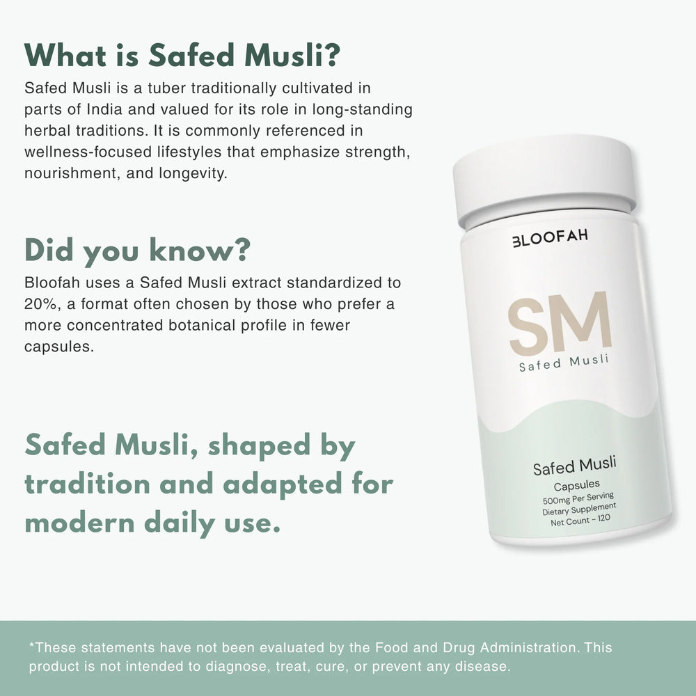 Safed Musli (Chlorophytum borivilianum) has been traditionally valued in Indian wellness practices, where it was commonly used as part of routines supporting strength, endurance, and overall vitality when consumed regularly.